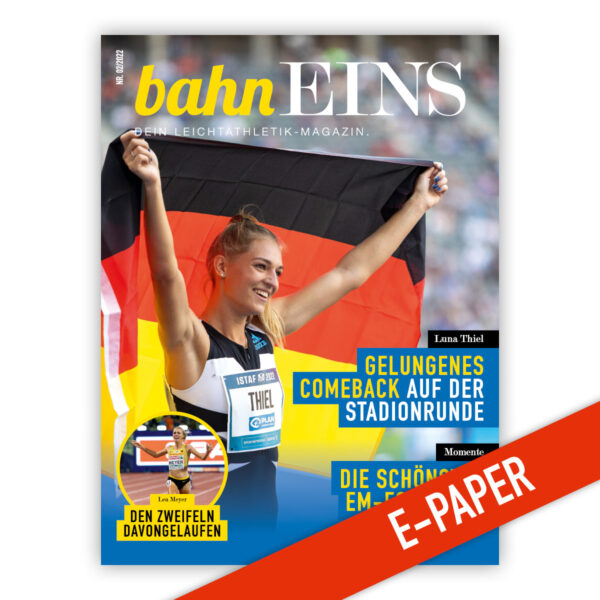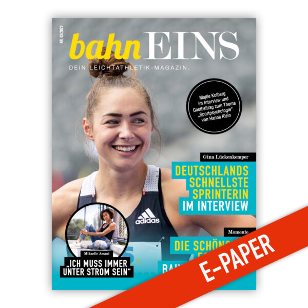 bahnEINS – Dein Leichtathletik-Magazin. In unserer aktuellen Magazinausgabe erwartet dich auf 100 Seiten einmal mehr eine abwechslungsreiche Mischung aus spannenden Geschichten, Interviews und tollen Fotos. Absolut lesenswert ist die ausführliche Titelstory über Deutschlands erfolgreichste Leichtathletin der Gegenwart: Malaika Mihambo. Mit ihr hat Torben Siemer gesprochen. Er zeichnet auf zwölf Seiten im Magazin ihre Erfolgsgeschichte der letzten Jahre nach und Malaika verrät, warum sie nun doch Deutschland als Trainingsort gegenüber den USA vorzieht und was sie aus ihrem Urlaub in Peru für das Training mitgenommen hat. Im Magazin erwartet dich ebenfalls ein großes Interview mit Sprinterin Rebekka Haase sowie ein Interview mit Marathon-Europameister Richard Ringer. Beide Interviews hat Thorsten Eisenhofer geführt. Ein Porträt über Para Kugelstoßer Niko Kappel und die aktuelle Kolumne „MAXimale Leidenschaft“ von Mittel- und Langstreckenspezialist Maximilian Thorwirth ist ebenso mit im Magazin sowie eine 24-seitige Bildstrecke/Fotoreportage von den Deutschen Leichtathletik Hallenmeisterschaften 2023 in Dortmund und einer weiteren Bildstrecke mit Impressionen und Momenten der Hallensaison 2023. Unter anderem mit Aufnahmen vom ISTAF INDOOR in Berlin, dem Indoor Meeting Karlsruhe, dem Sparkassen Indoor Meeting in Dortmund und der BKK Freudenberg Hochsprung Gala in Weinheim.